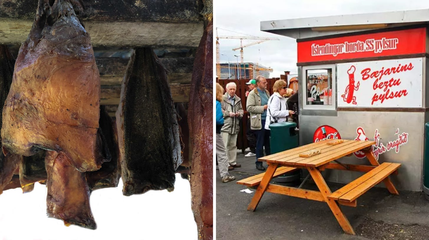 ❓ Voi ați avea curaj să gustați faimosul hákarl (rechin fermentat) sau ați merge direct la un hot dog de la Bæjarins Beztu Pylsur?