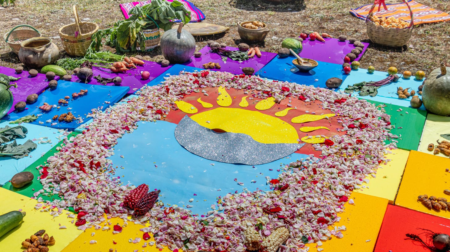 În satele din Anzi, hrana este un ritual al recunoștinței față de pământ. În fiecare zi, oamenii aduc ofrande zeiței Pachamama („pacha” însemnând în limba aymara, vorbită de nativii din Anzi, „pământ, lume, univers, timp”), Mama Pământ, înainte de a mânca. Mâncarea este legătura cu strămoșii, cu anotimpurile și cu ceea ce natura dăruiește.