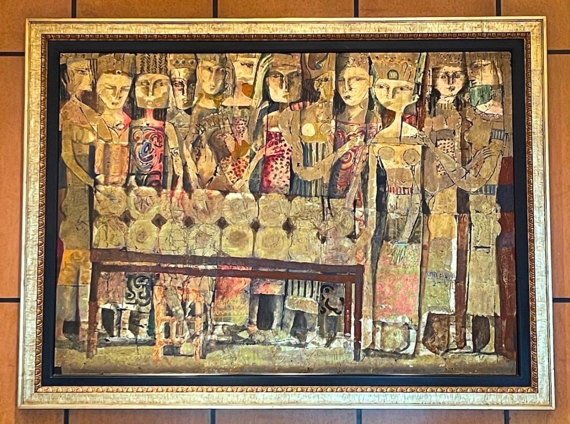 De cum am intrat în hotelul „Four Seasons Cairo Nile Plaza”, m-au intrigat tablourile, începând cu cel de deasupra recepției. Hotelurile au, de multe ori, tablouri generice, banale, simpluțe, ca să nu zic altfel. Acestea, în schimb, aveau viață, suflet și emoție. Le-am privit îndelung, apoi le-am pozat rapid, țac țac, pe unde le-am găsit prin hotel. Și le-am găsit peste tot, sunt zeci de picturi și de sculpturi.