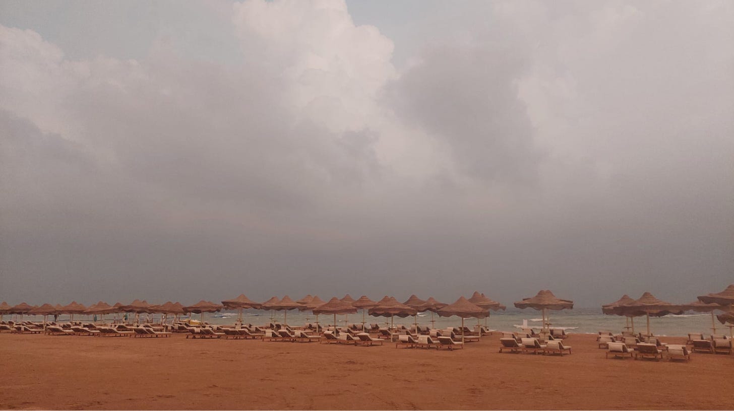 ❌ Mi-am imaginat întâlnirea cu un Egipt deșertic și canicular. Am fost întâmpinat de Delta Nilului ireal de verde, de selenarul Munte Sinai zimțat ca Făgărașii văzuți din Porumbacu de Jos și de o ploaie torențială cu descărcări electrice care a inundat plaje și a estompat culoarea roșiatică a munților.